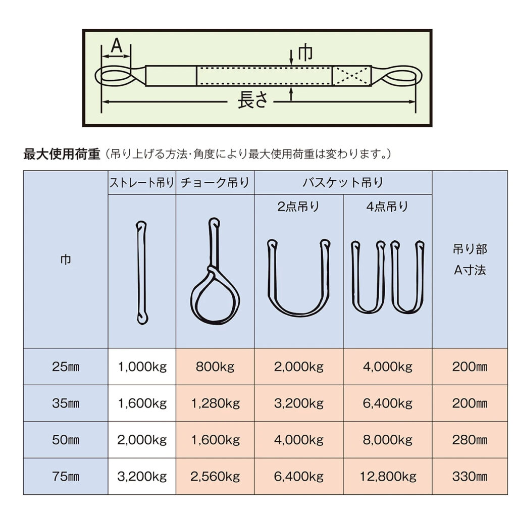 ※最大使用荷重は吊り上げる方法・角度により変わります。