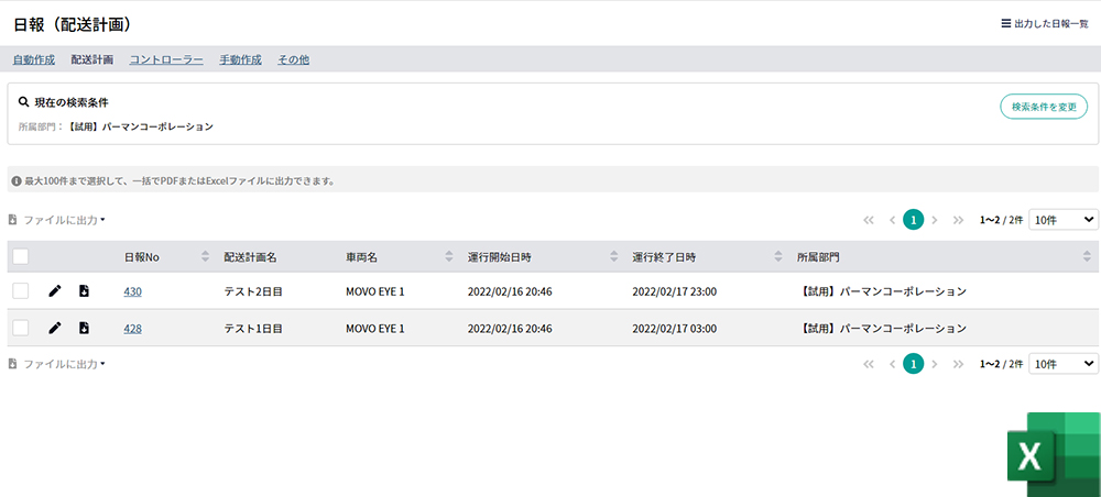 日報は運行時間、滞在時間、作業時間、走行距離や速度と時間のグラフなど、一般的な日報をワンクリックで作成できます。