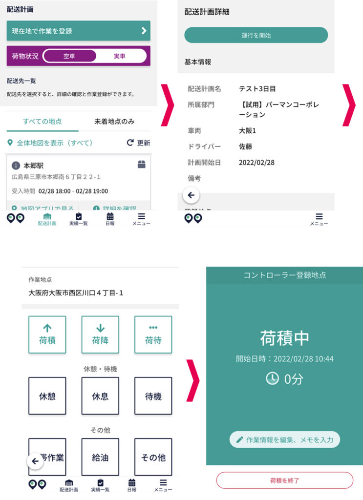 詳細な運行記録や日報を、ドライバー用のコントローラーで登録、記録。配送計画の指示や配送地点の軒先条件などをスマートフォンで伝達することも可能