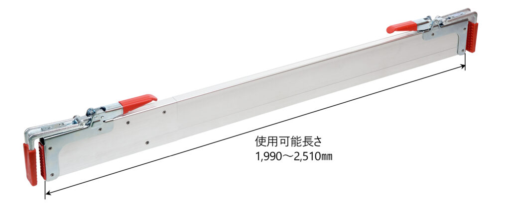 平ボディトラックの荷台内寸に合わせて本体を伸縮し、両サイドのアオリにロック部を挟んでハンドルで固定するだけの簡単設計で直感的に操作できます。