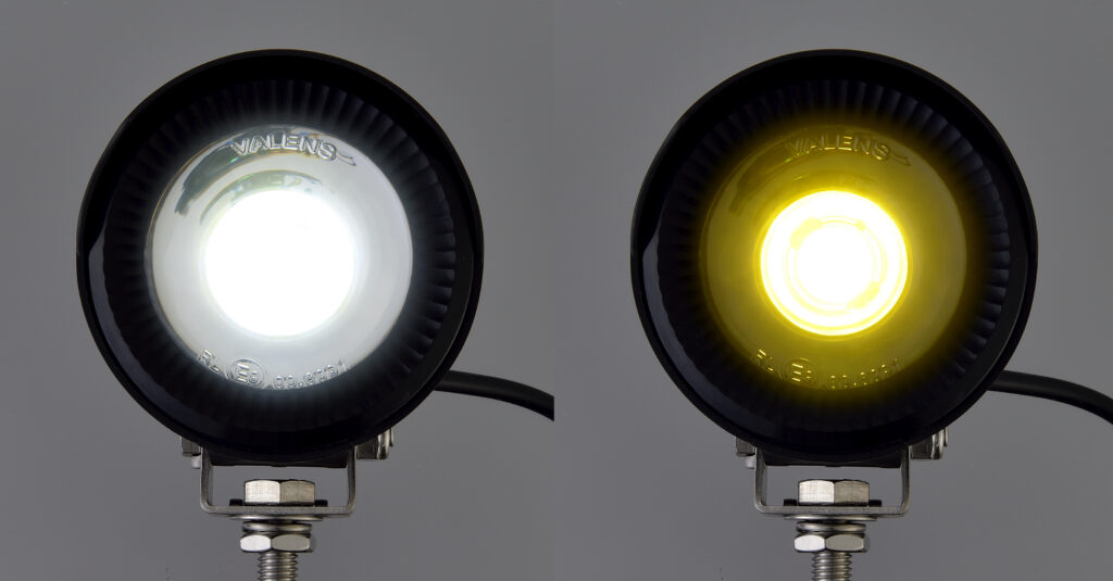デュアルカラー路肩灯スポットビームは、その名の通り、白色のLEDと黄色のLEDに切り替えることができる灯火装置です。この2つの色はそれぞれ異なる状況で最適化された能力を発揮し、後輪タイヤ周囲の夜間視認性と、安全性を高めることができます。